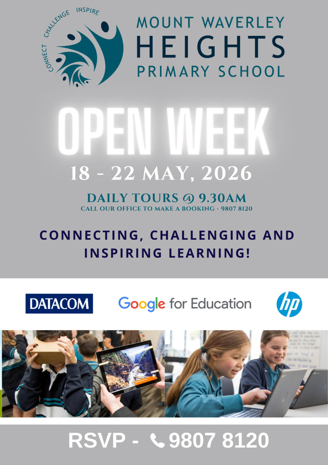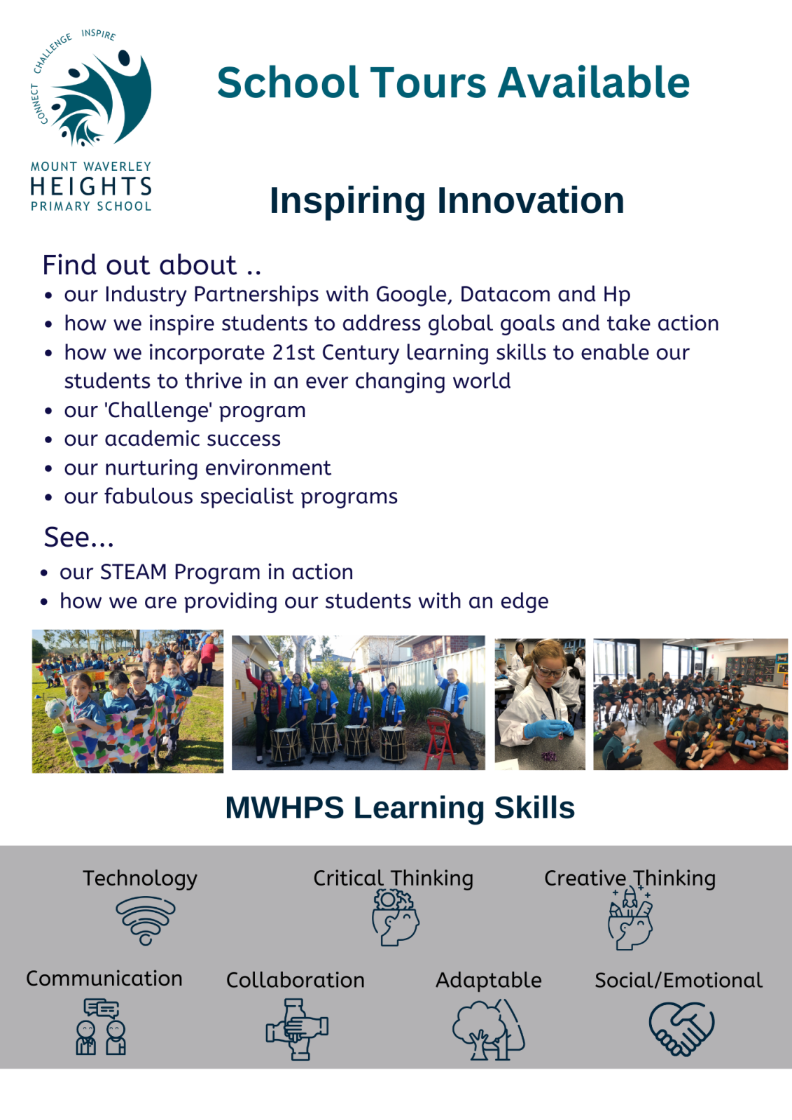 MWHPS has just developed a technology partnership with Datacom, Google, Hewlett-Packard and BenQ. This partnership will see MWHPS become a world-class IT Beacon School with cutting edge practices that will assist students on the journey to becoming future leaders in the knowledge economy. 21st Century skills such as collaboration, communication, personal/social skills and critical & creative thinking skills will be embedded in a curriculum brought to life through innovative practices.